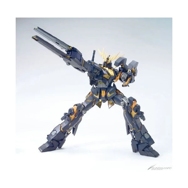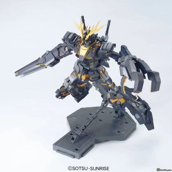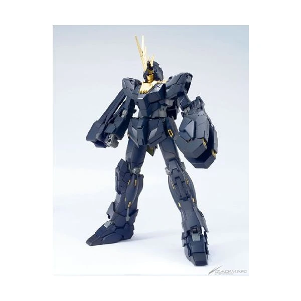 The RX-0 Unicorn Unit 02 Banshee Gundam MG Model Kit comes from Episode 4 of Unicorn Gundam and is known as the Black Unicorn. It converts from Unicorn Mode to Destroy Mode just like MG Unicorn. The gold-colored psycho frame is made of special material which reflects UV light when black light hits the frame.